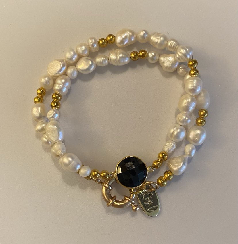 Bracelet deux rangs en pierre fine et perle baroque avec fermoir doré à l’or fin.