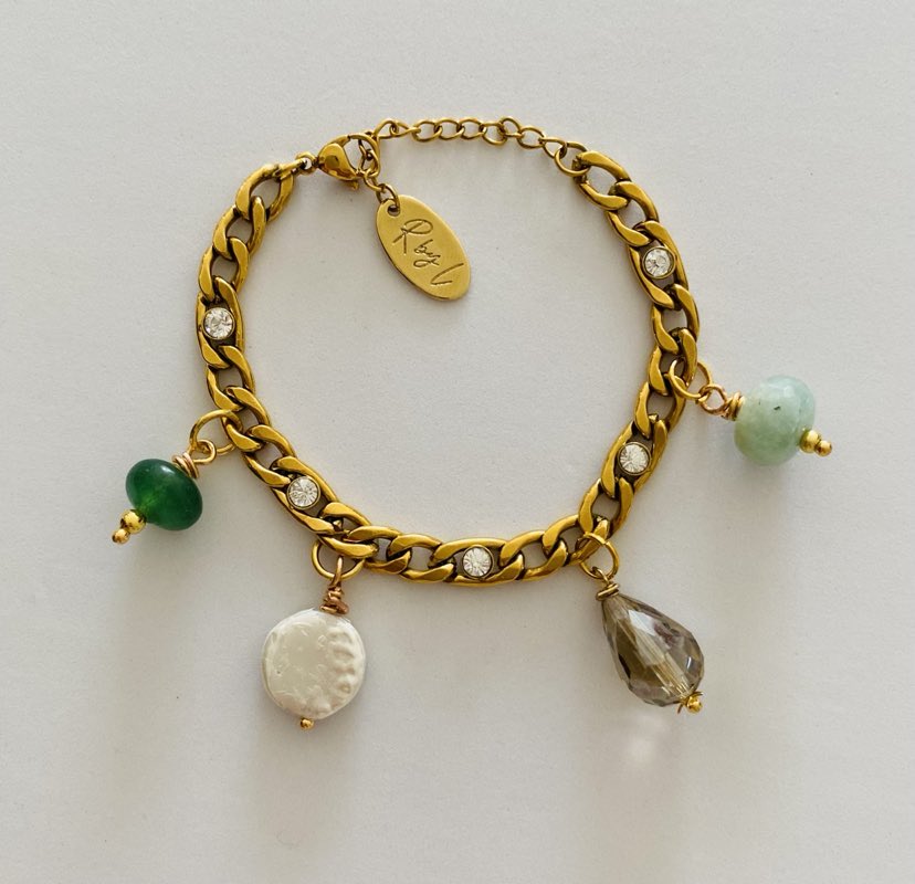 Bracelet en chaîne doré à l’or fin avec des pierres fines et une perle baroque.